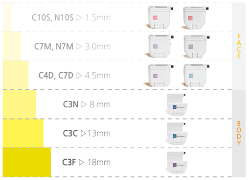 Hifu có thể tác động đến độ sâu chính xác nhất, phù hợp nhất để tạo hiệu quả tối ưu trong trẻ hóa da như biểu bì (1,5 mm) - hạ bì (3,0 mm) - SMAS (4,5 mm) - mỡ (8,13 và 18 mm) nhờ đó